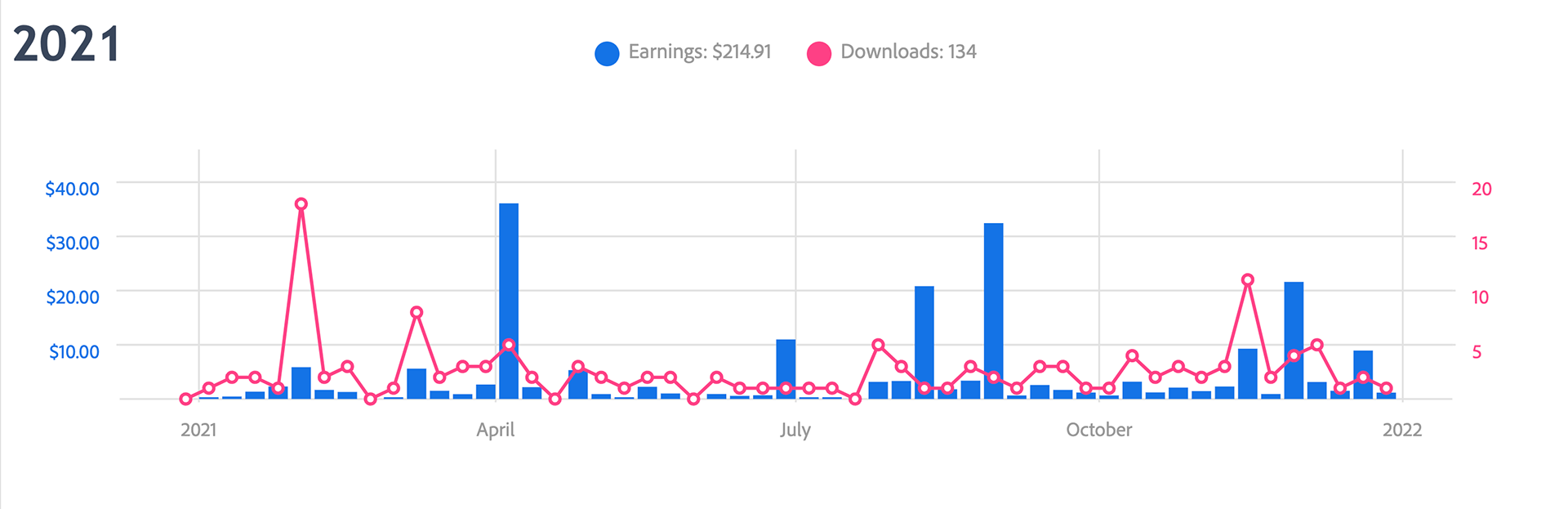 Activity chart comparison from 2021 and 2022. Passive income is cool. My photographs are making me money while I sleep.