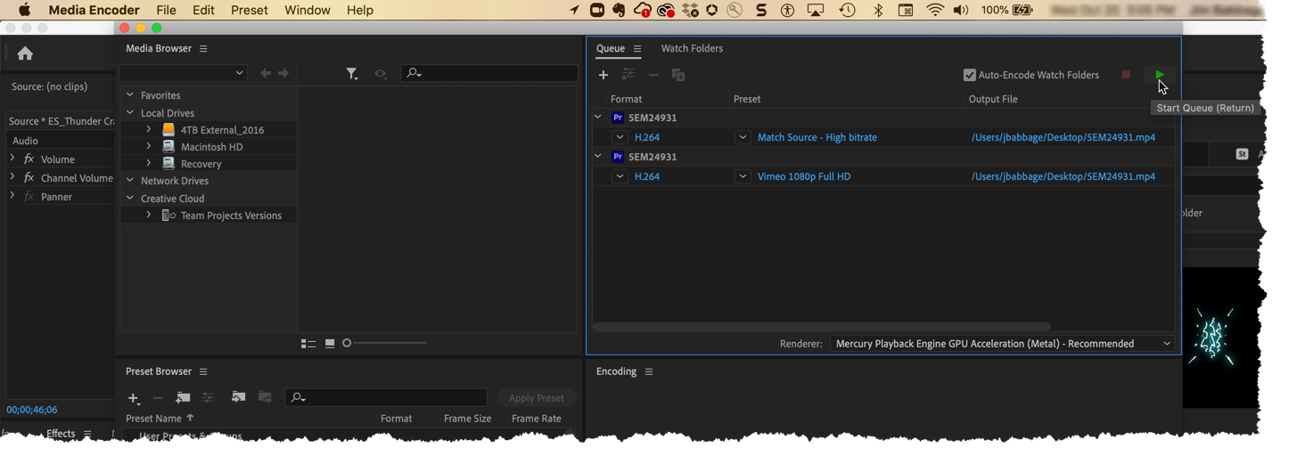 The only thing left to do was export. I chose a couple presets for the export for a couple different levels of quality. Export presets save you a lot of time - and confusion, if you're new to Premiere. Just pick the appropriate platform for playback - YouTube or Vimeo, for example, and choose Export or - if you need multiple versions, create them one at at a time and add them to the export queue. In my case, I created two versions, one slightly lower in quality for a smaller file size.